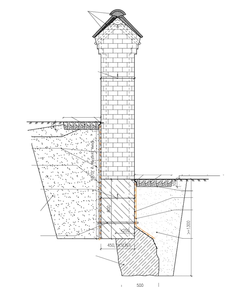 Taip pat numatyti hidroizoliacijos, drenažo ir konstrukcijų apsaugos sprendiniai, leidžiantys sumažinti drėgmės poveikį pamatams ir mūro konstrukcijai. Projekte pateiktas darbų sąnaudų kiekio žiniaraštis, kuriame detalizuojami tvoros pamato stiprinimo, mūro atkūrimo ir kitų konstrukcinių darbų kiekiai.
